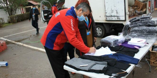 Jorge Yáñez y Miguel Ángel Valdivieso, funcionarios del Departamento Técnico de la aduana de Los Andes llegaron hasta la fundación para hacer entrega de las prendas, que recibió la Directora del Programa “Aldeas Infantiles Pillán”, Paola Vega.