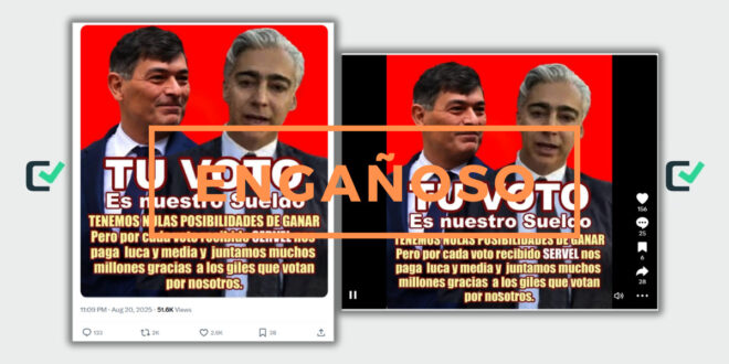 Junto a las fotos se lee el texto: “TU VOTO. Es nuestro Sueldo. TENEMOS NULAS POSIBILIDADES DE GANAR Pero por cada voto recibido SERVEL nos paga luca y media (1.500 pesos) y juntamos muchos millones gracias a los giles que votan por nosotros”. El contenido se comparte también en Facebook, Instagram, y TikTok.