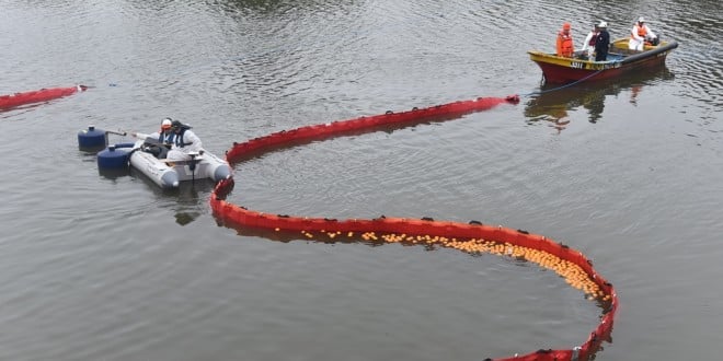 La actividad se desarrolló en uno de los canales de evacuación de aguas lluvias de la refinería, donde se simuló con naranjas la fuga de gasoil en la ribera sur del río. Inmediatamente se activó el plan de contingencia para estos casos y, en conjunto con los pescadores, se desplegó la barrera de contención para la recuperación del simulado derrame.