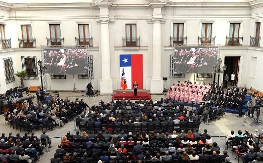 En el Patio de Los Cañones del Palacio de La Moneda, la Presidenta de la República, Michelle Bachelet, acompañada por los ministros del Interior y Seguridad Pública, Jorge Burgos; y de la Secretaría General de Gobierno, Marcelo Díaz, participó en la ceremonia de celebración del Día Nacional de las Iglesias Evangélicas y Protestantes de Chile.