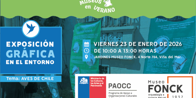 El viernes 23 de enero de 2026, desde las 10:00 hasta las 13:00 horas, el Museo Fonck, ubicado en 4 Norte 784, esquina 1 Oriente, Viña del Mar, llevará a cabo gratis una exposición gráfica en el entorno dedicada a las aves de Chile.