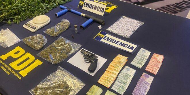 El trabajo de análisis criminal e inteligencia policial desplegado por los oficiales de la PDI, permitió conseguir órdenes de entrada y registro para siete domicilios, seis de ellos ubicados en Glorias Navales y uno en Concón, desde los que fueron incautados 203 gramos de cannabis sativa, 65 gramos de cocaína base, una escopeta, un revólver, munición, dinero en efectivo y elementos para la dosificación de drogas.