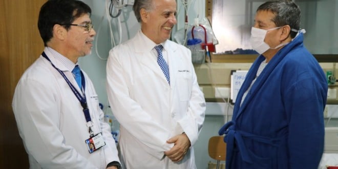 Dr. Oneglio Pedemonte, Jefe de la UCI Cardiovascular del establecimiento, explicó que “Mario es portador de una miocardiopatía dilatada, él viene desde Iquique, vino en una condición muy precaria inicialmente, gracias a los tratamientos de la insuficiencia cardiaca que son muy adecuados, además de la rehabilitación cardiovascular permitió una espera larga de casi dos años y después de esa espera logró su anhelo de trasplantarse y lo pudimos realizar hace exactamente ocho días atrás. Si bien es cierto se trata de una cardiopatía terminal, con la rehabilitación pudo mantenerse y también es muy importante el esfuerzo que hizo el hospital porque el pudo mantenerse estando acá, un esfuerzo también de su familia en la espera de este anhelado premio, que fue la donación de un órgano que permitió que el pudiese cambiar su corazón por un corazón normal y de esa manera va a poder recuperarse y esperamos que en tres meses más puedan volver a su ciudad que es Iquique».