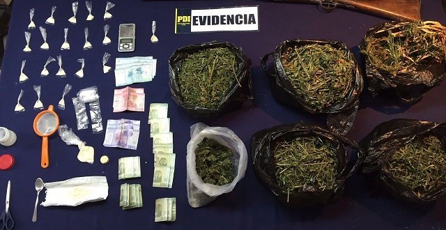 De esta manera, la PDI sacó de circulación 37,83 gramos de cocaína base, 1.226,6 gramos de cannabis sativa, droga equivalente a un total de 1.797 dosis y avaluada en más de 6 millones y medio de pesos.