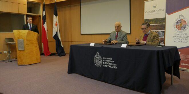 En el Auditorio del Aulario de Ingeniería de la Pontificia Universidad Católica de Valparaíso se efectuó la firma del Convenio Marco de Colaboración entre la universidad y la Asociación de Empresarios Vitivinícolas del Valle de Casablanca A.G. con el objetivo de formalizar el trabajo entre ambas instituciones en formación de capital humano y en el desarrollo de investigaciones en el marco del desarrollo tecnológico y sustentable del campo.
