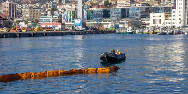 Víctor Araya, coordinador de operaciones de emergencia de la empresa Ambipar, por su parte, explicó que, “una vez que está hecho el confinamiento, comenzamos a recuperar el producto derramado con mangas o paños absorbentes, y se genera una zona de acopio en la superficie donde se acumula todo el material”.